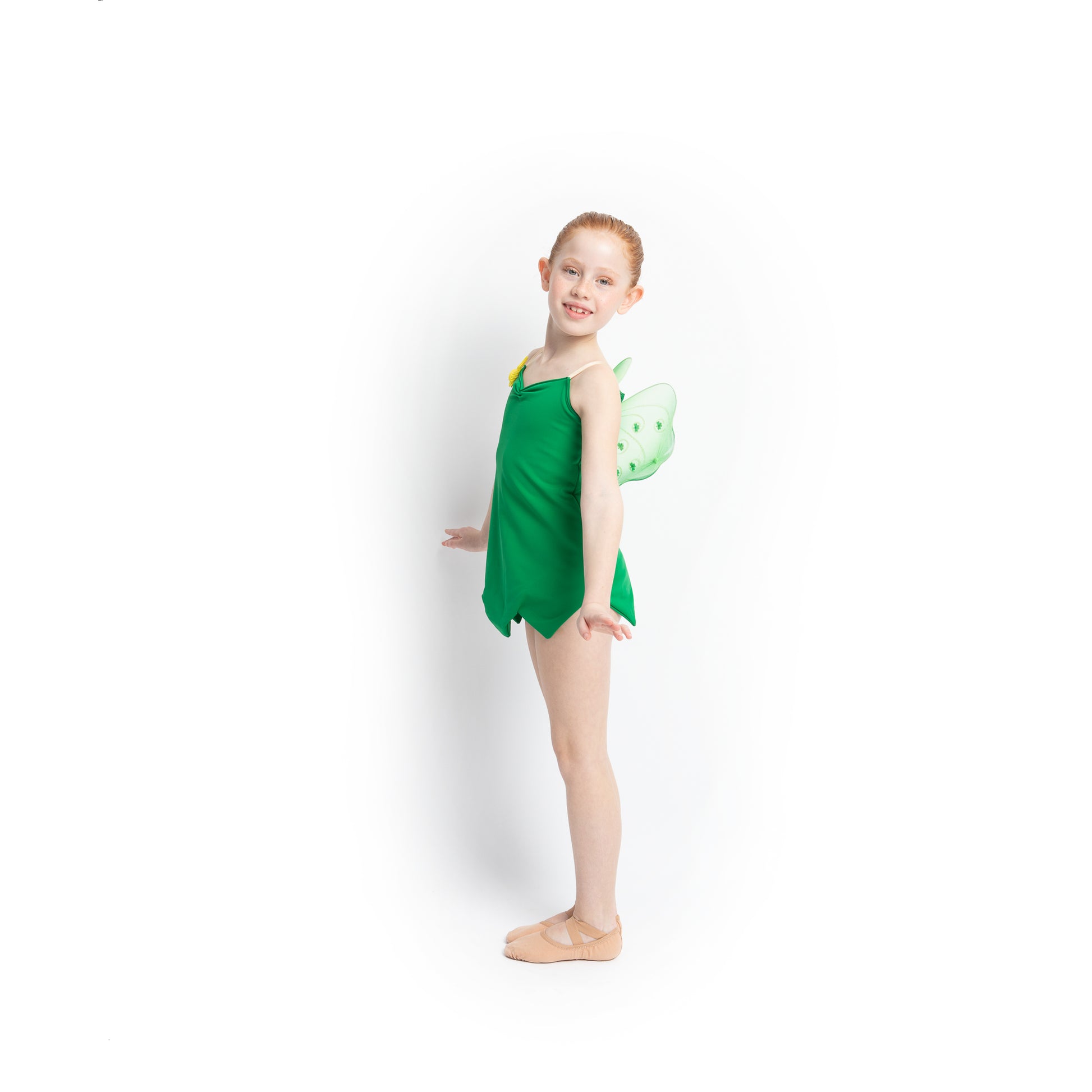Vestido verde corto de línea ligeramente evasé acabado en picos y con alitas a la espalda.
