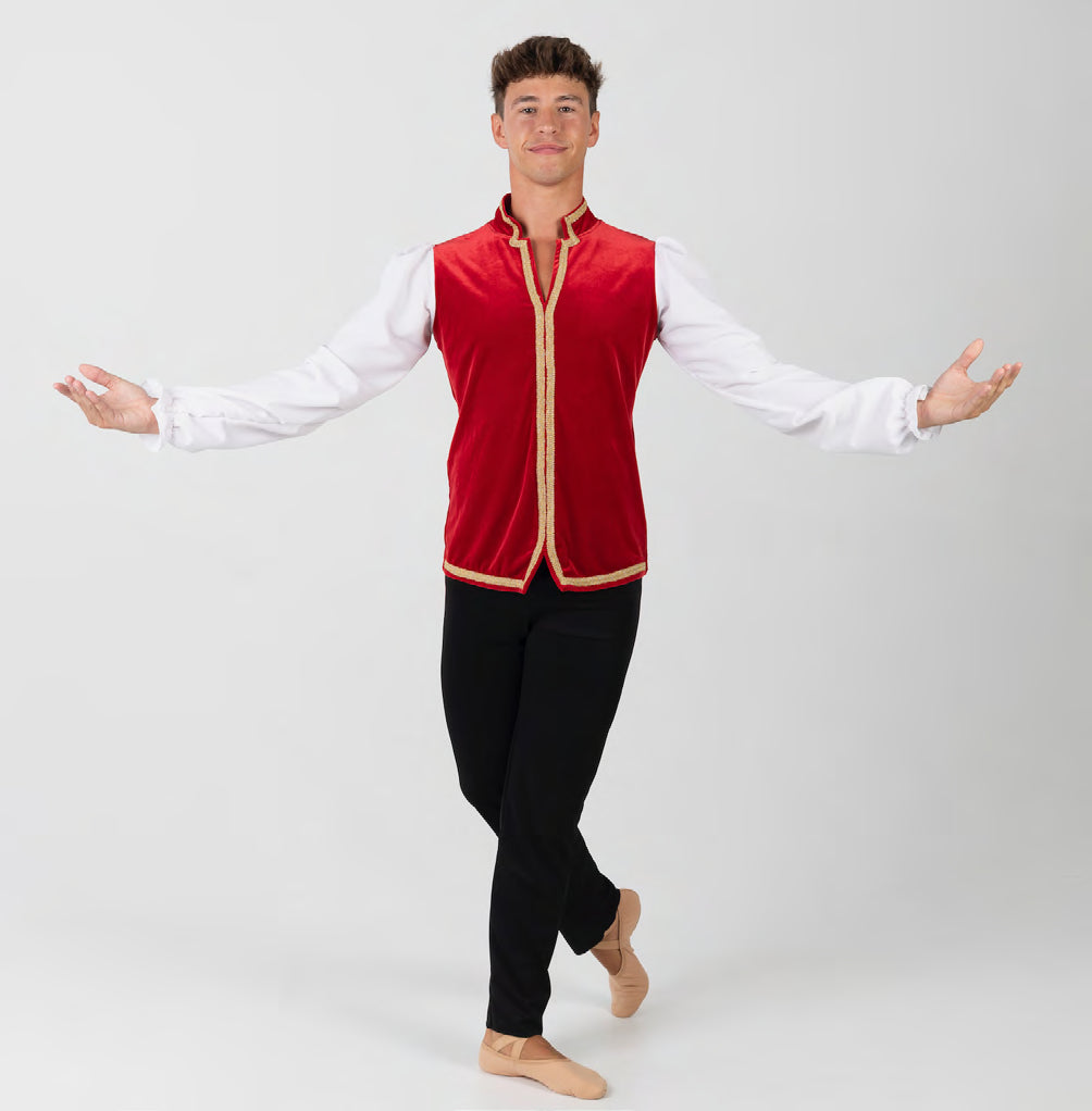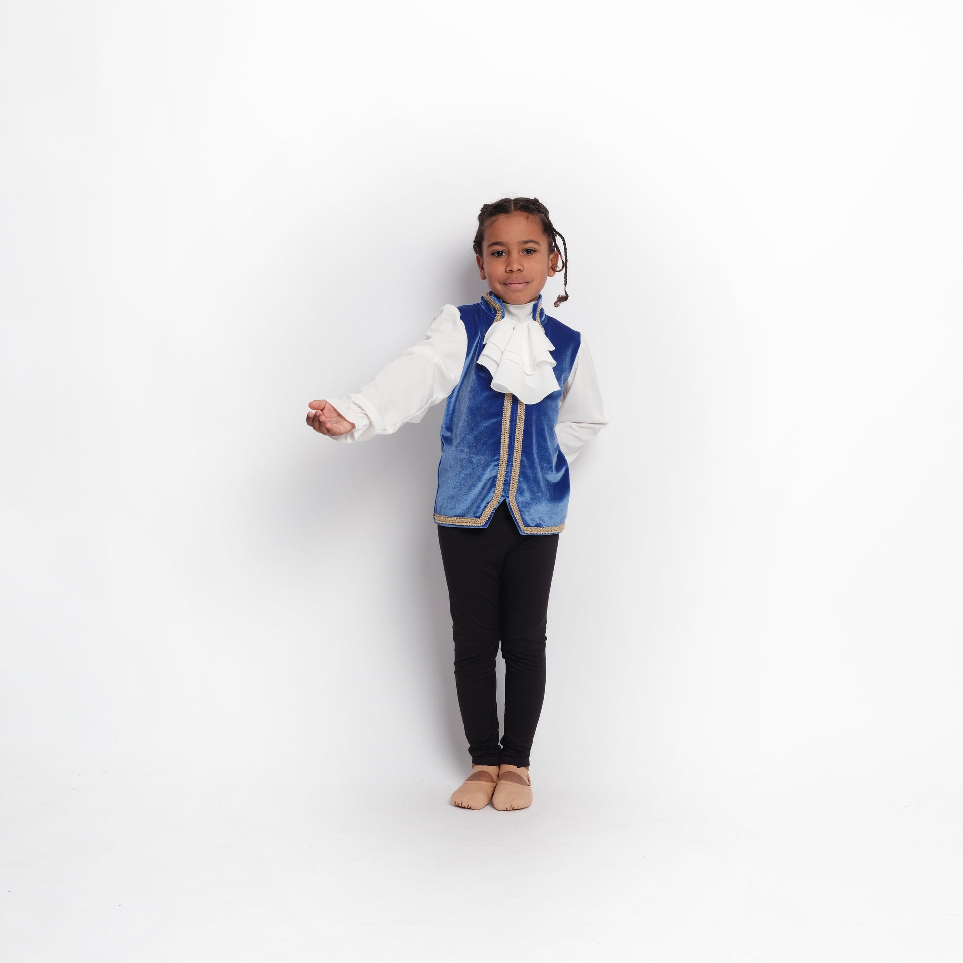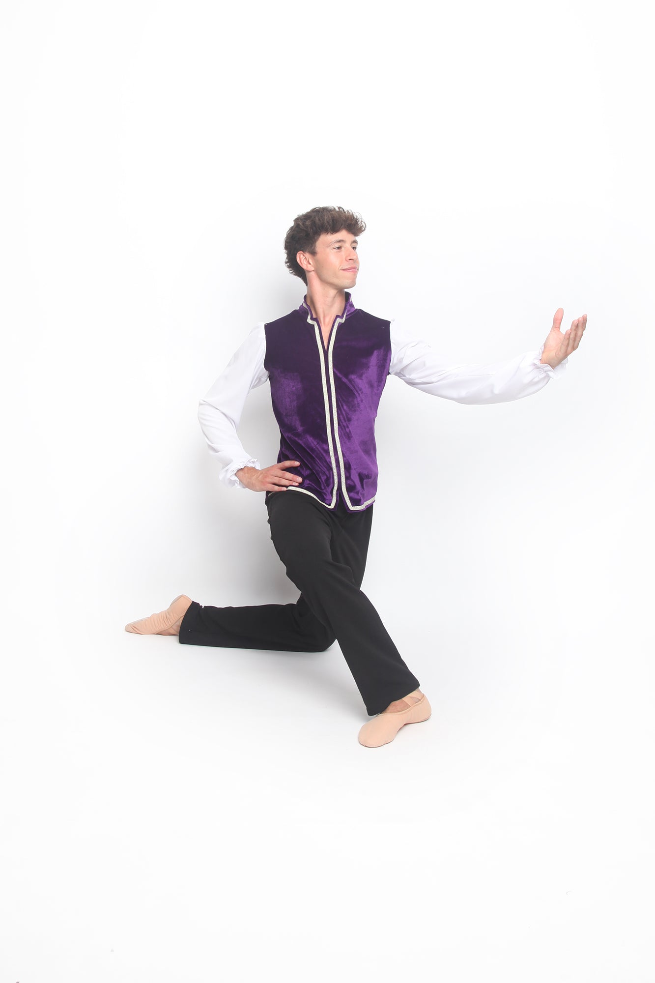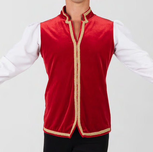 Chaleco de terciopelo, ceñido con cuello mao y una abertura postiza en el delantero.