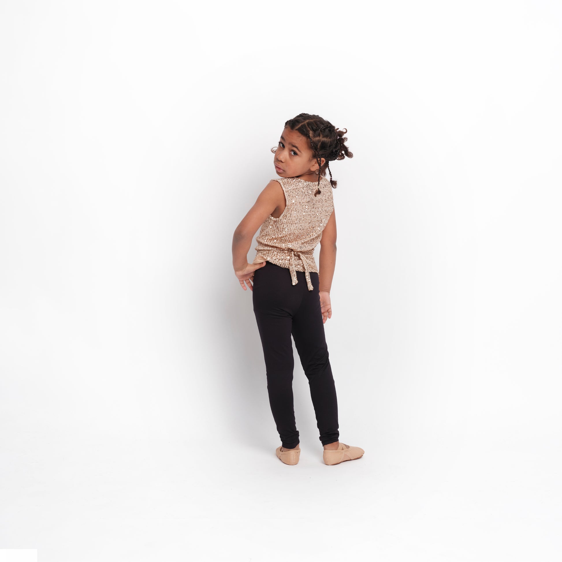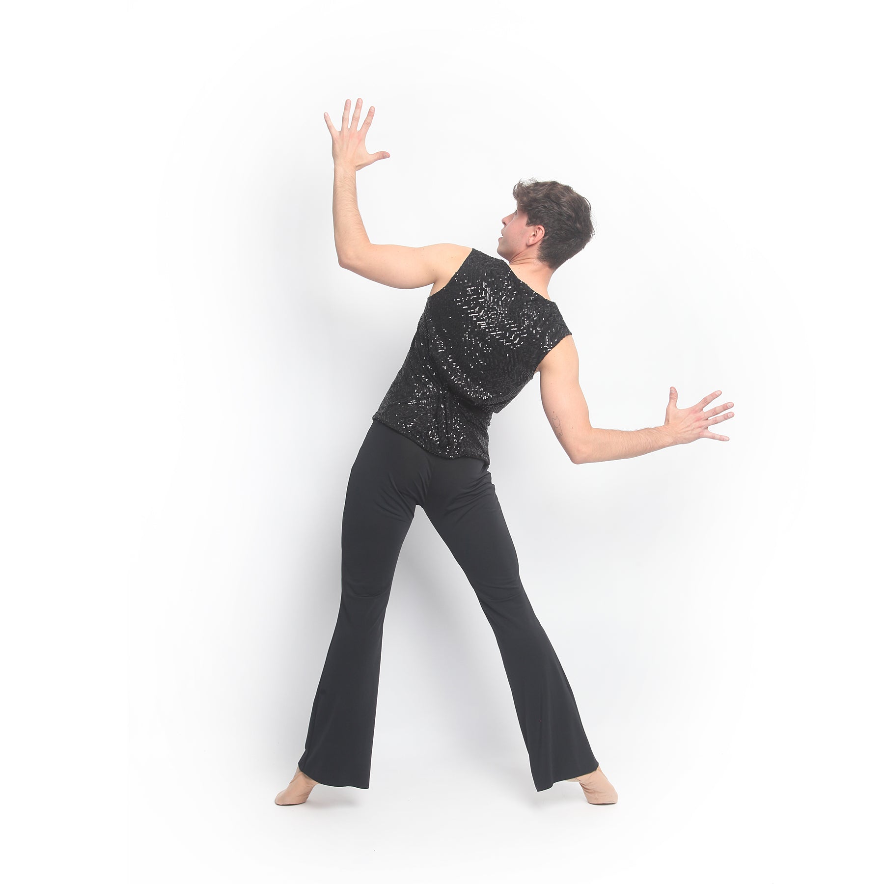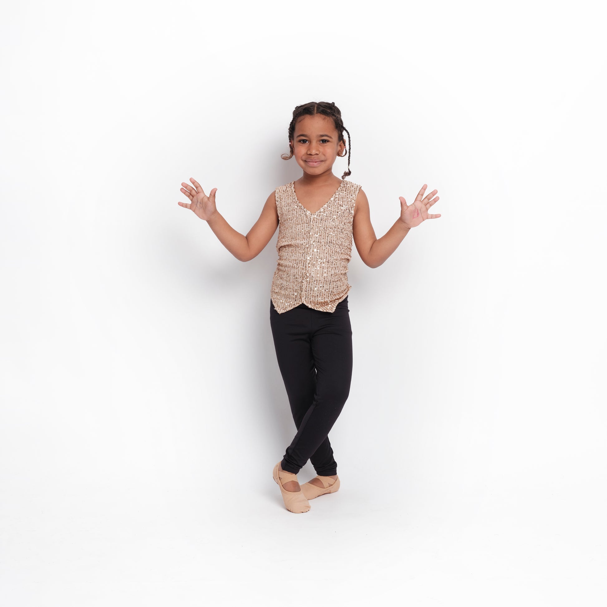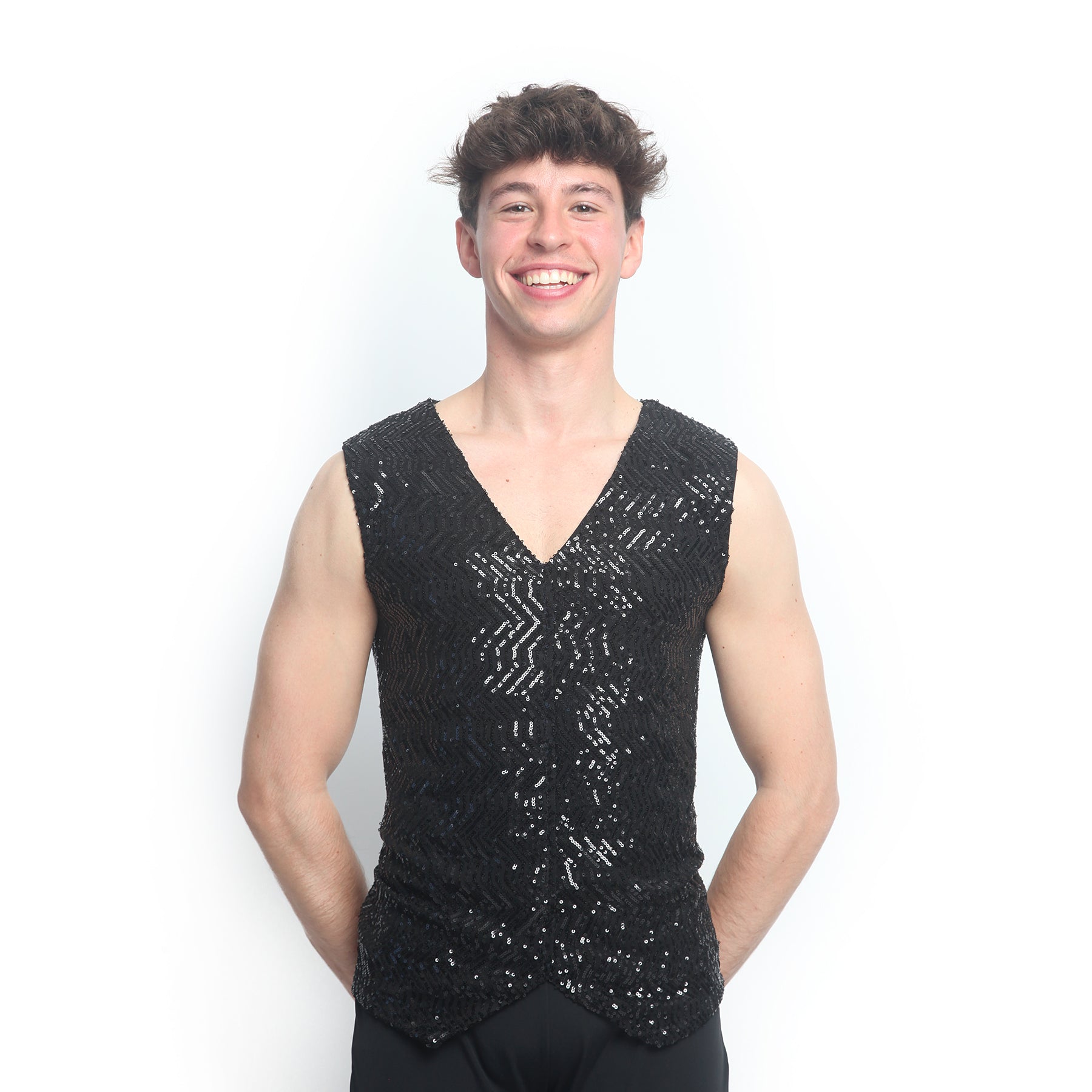 Chaleco unisex con frente fijo. Confeccionado en lentejuela. Ajustable a la espalda mediante dos tiras del mismo tejido.