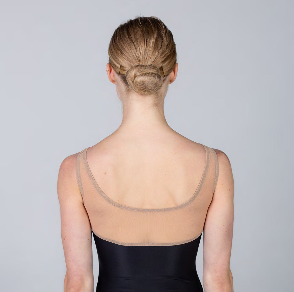 Maillot sin manga, con tul elástica transparente en el escote y espalda.