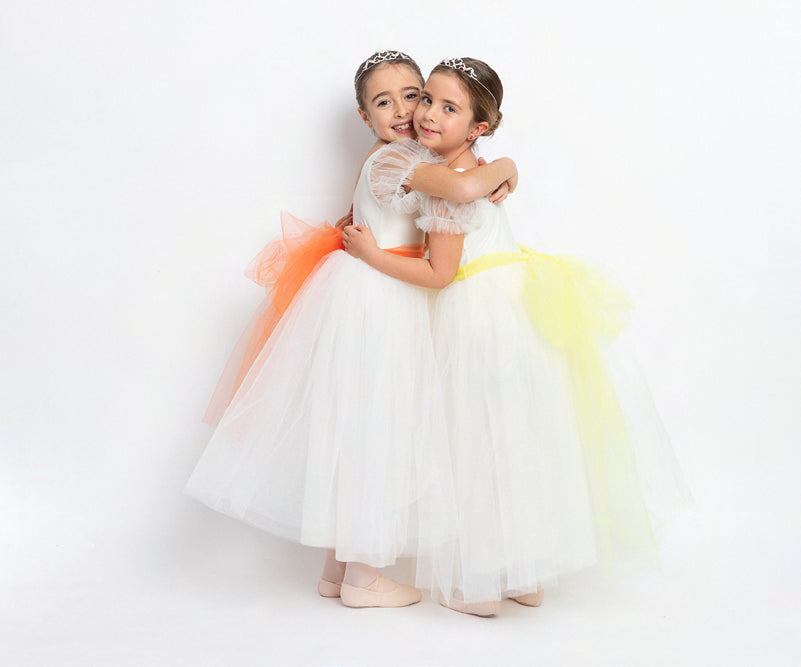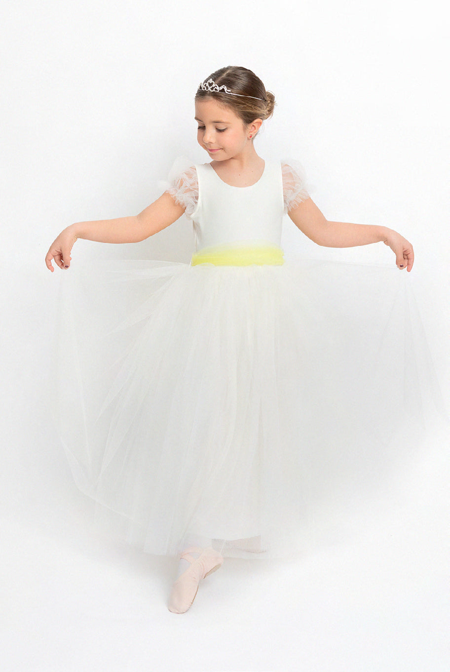 Tutú crudo con maillot, mangas farol y falda de tul, complementado con una lazada de tul. A escoger color de la lazada.