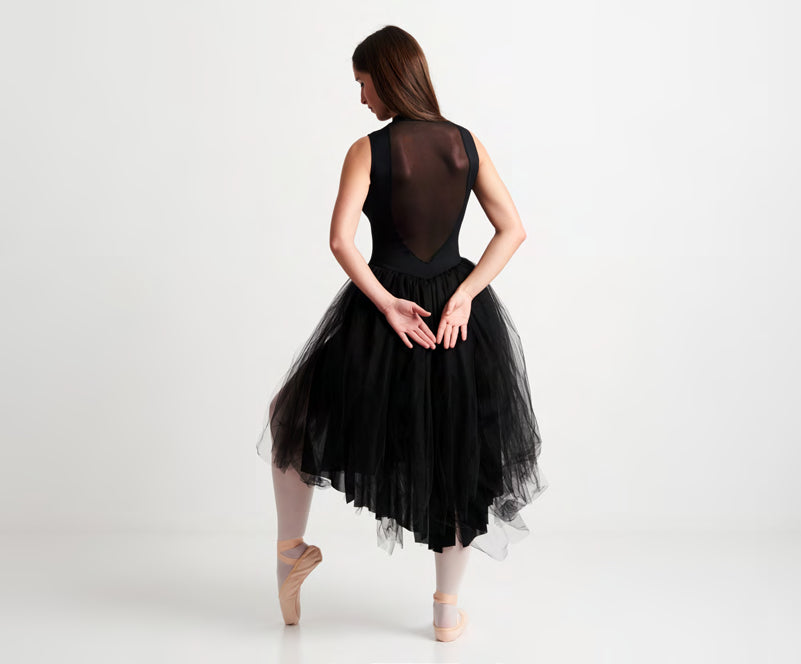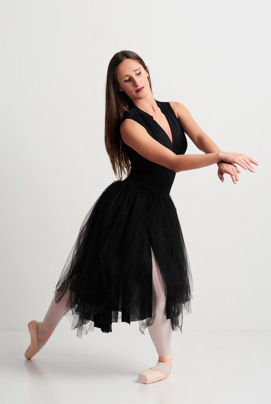 Cuerpo de licra, cremallera delantera, dos capas de tul suave y una de punto elástico.