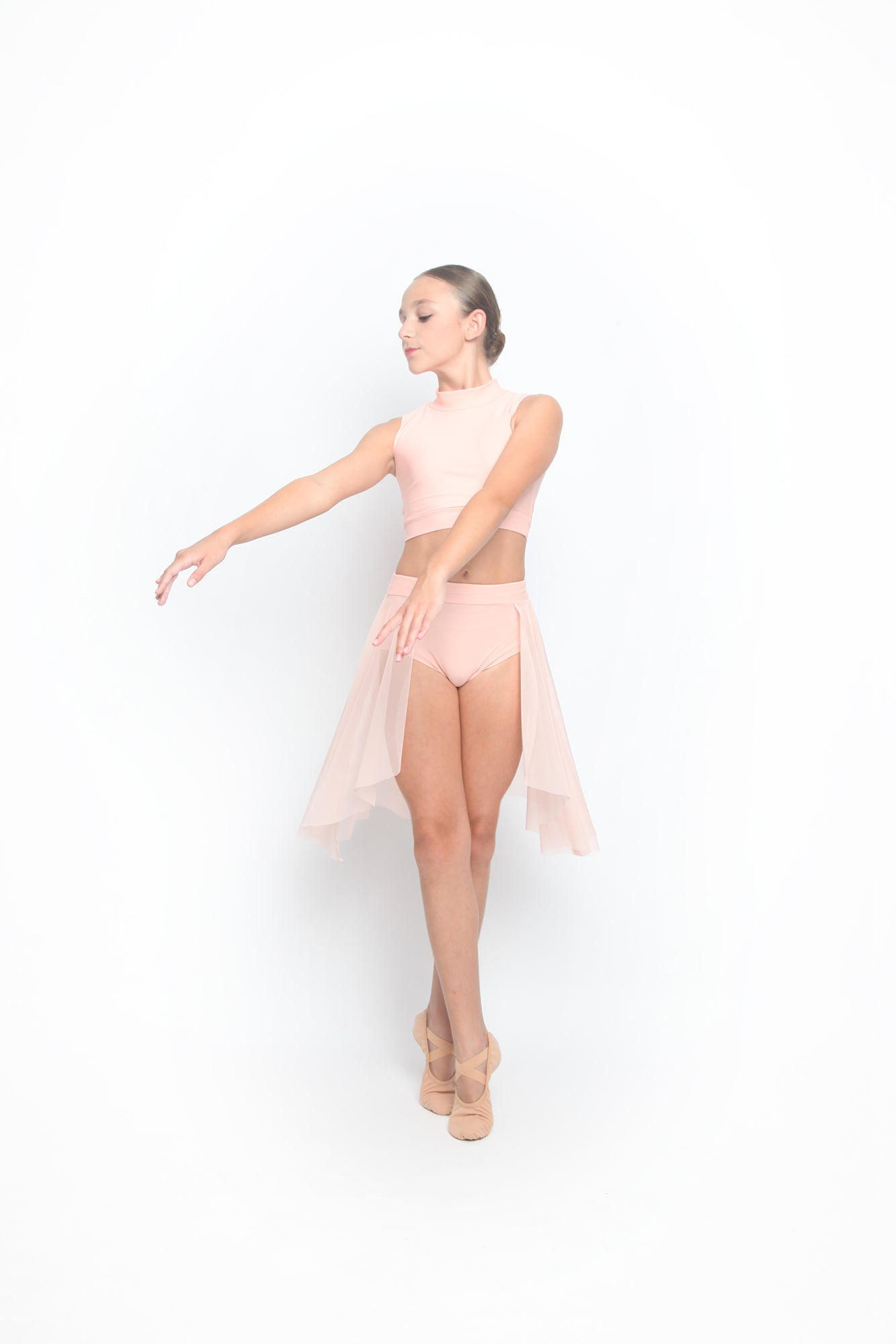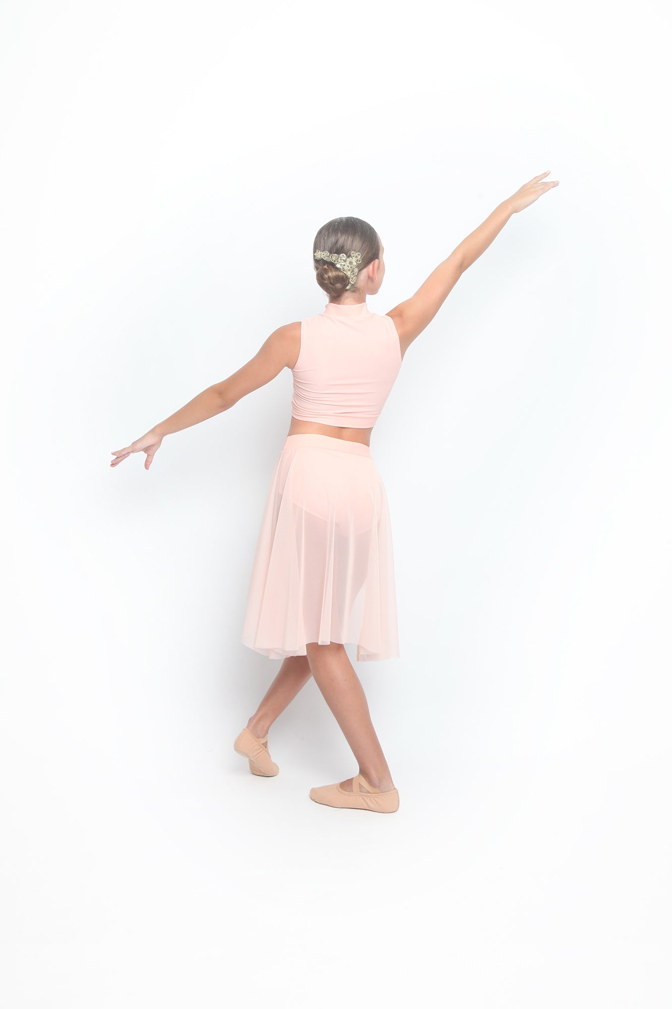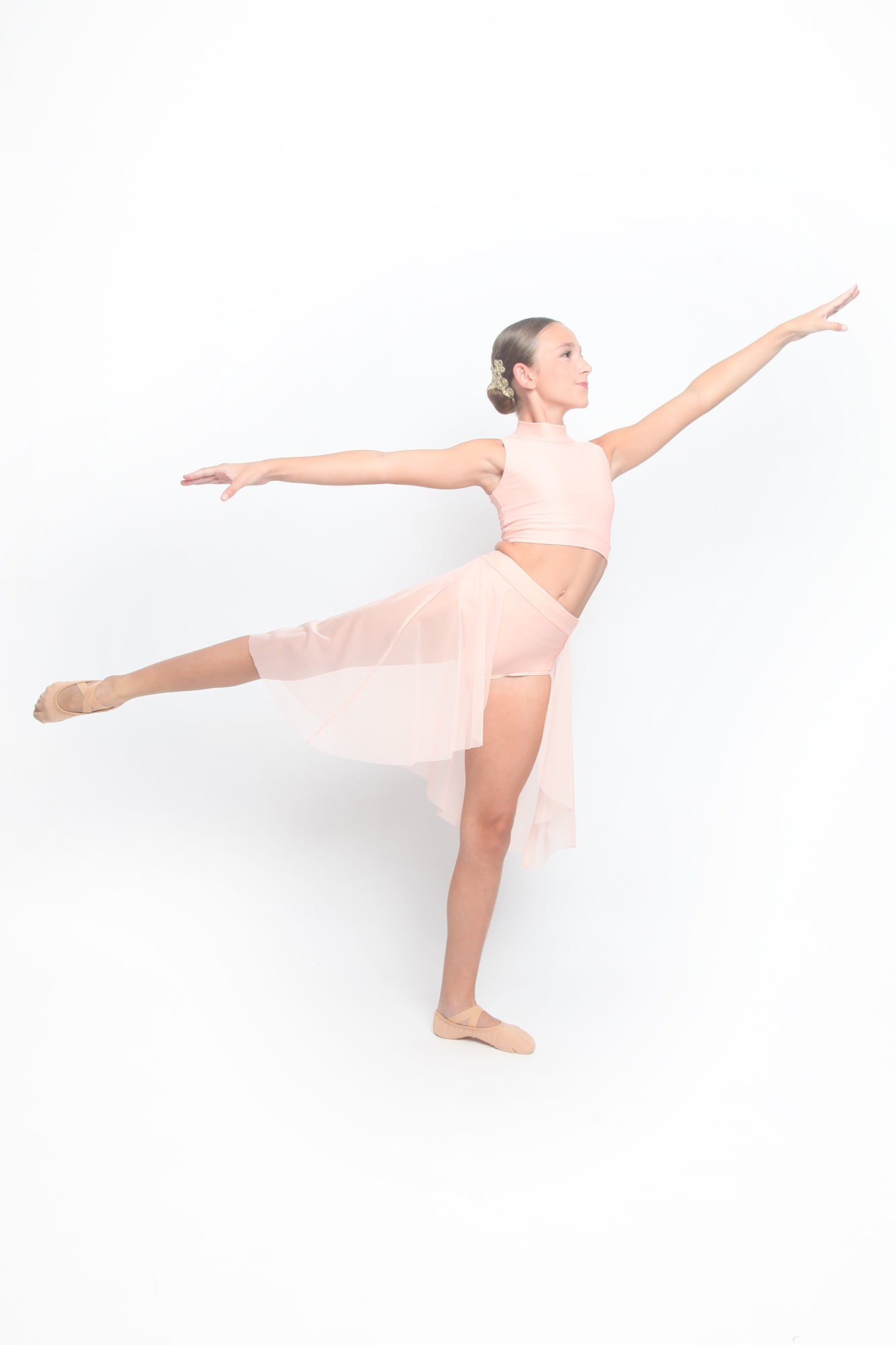 Falda de danza lírica confeccionada en tul ligero, diseñada para usarse sobre un body o conjunto. Su corte asimétrico realza la fluidez y aporta elegancia a cada movimiento en el escenario.