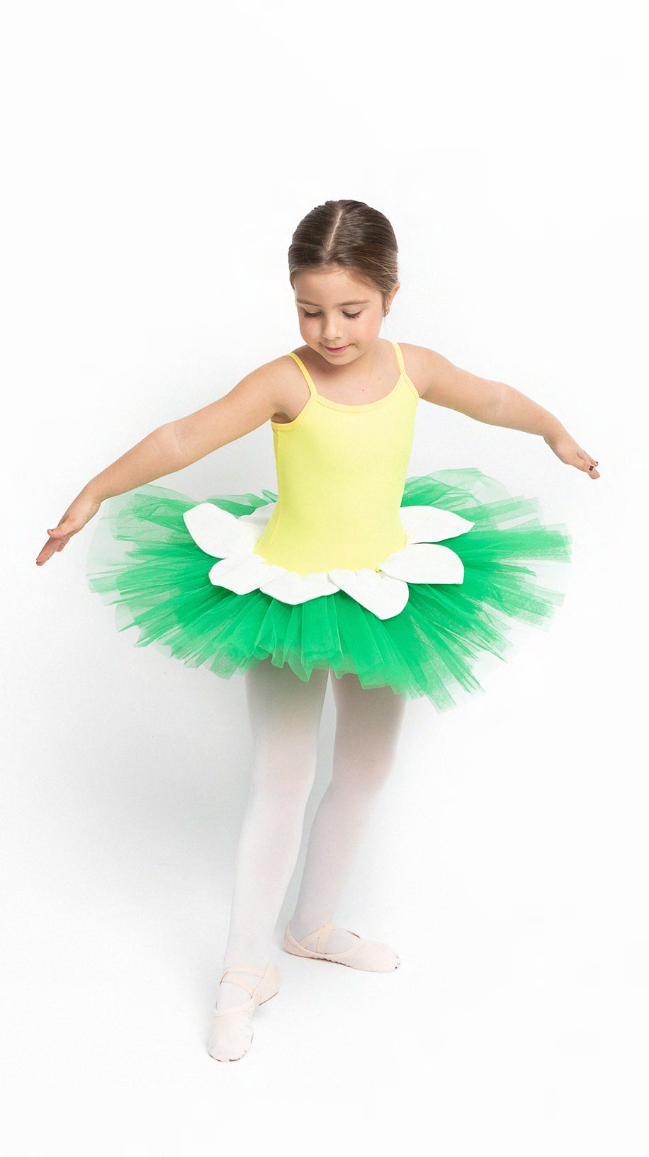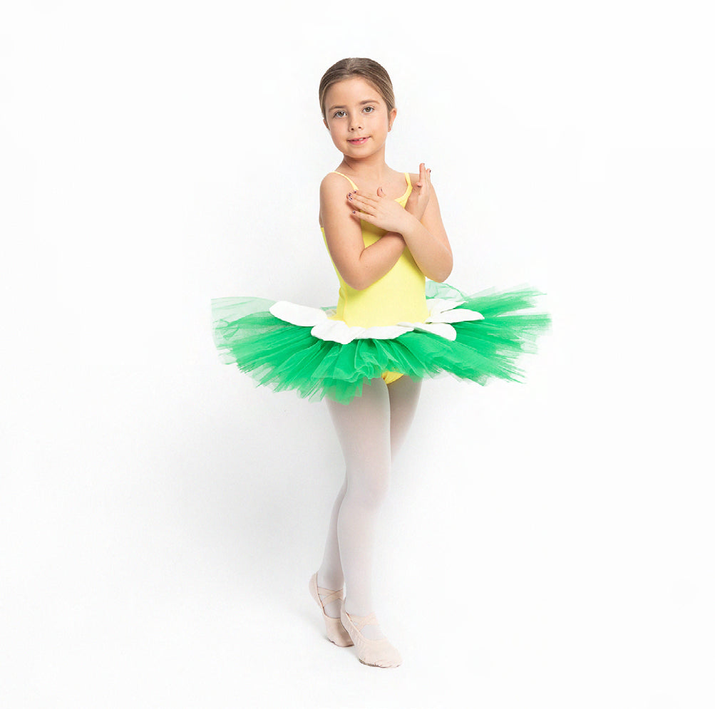 Tutú infantil, con maillot tirante de licra incorporado. Falda con capas de tul verde y una capa de pétalo blanco.