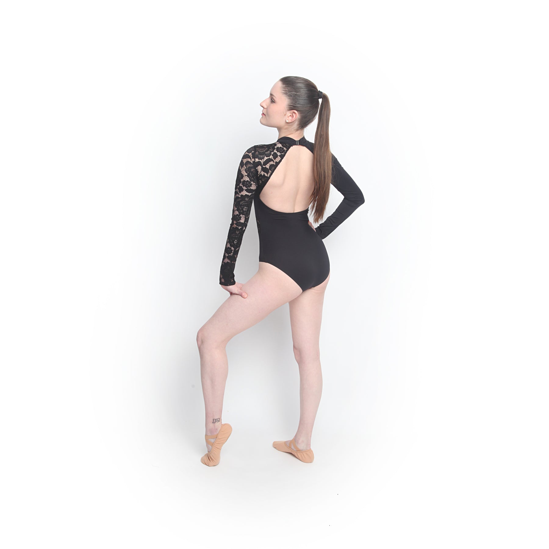Maillot asimétrico de manga larga y cuello alto con parte de blonda. Hecho con microfibra.