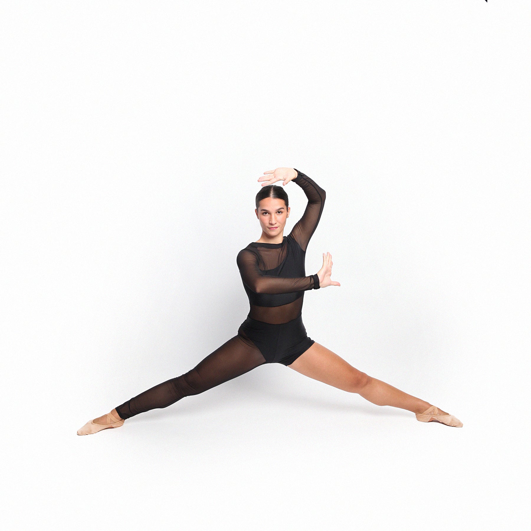 Mono manga larga, con una pierna en transparencia y la otra terminada como pantalón corto. Realizado en licra.
