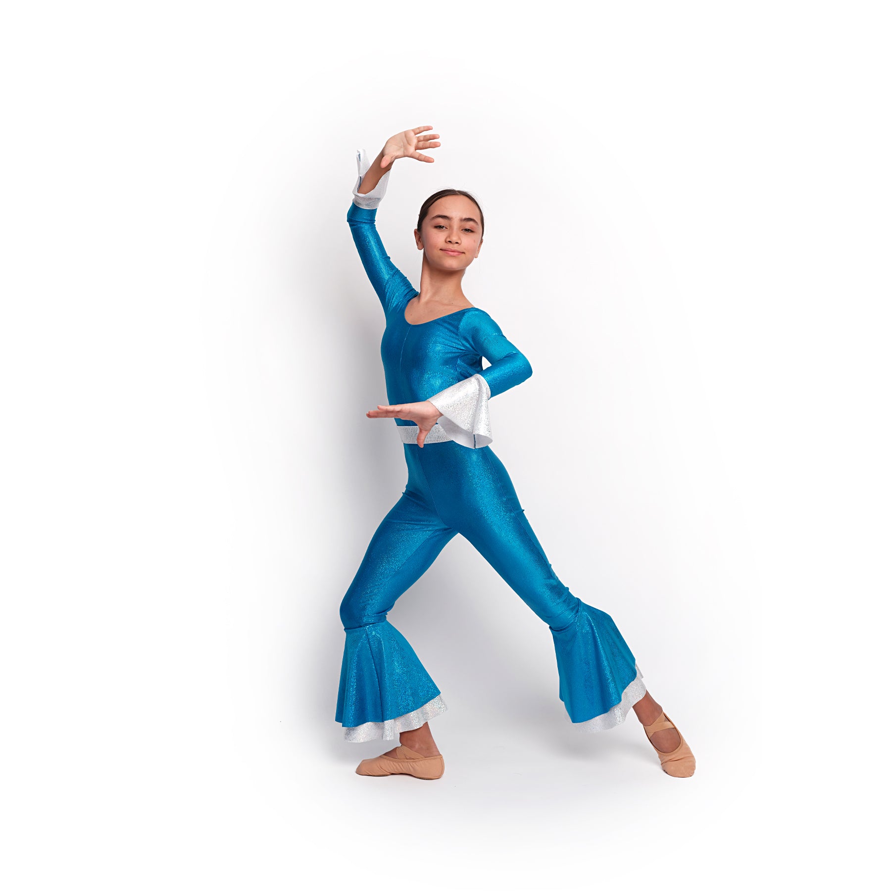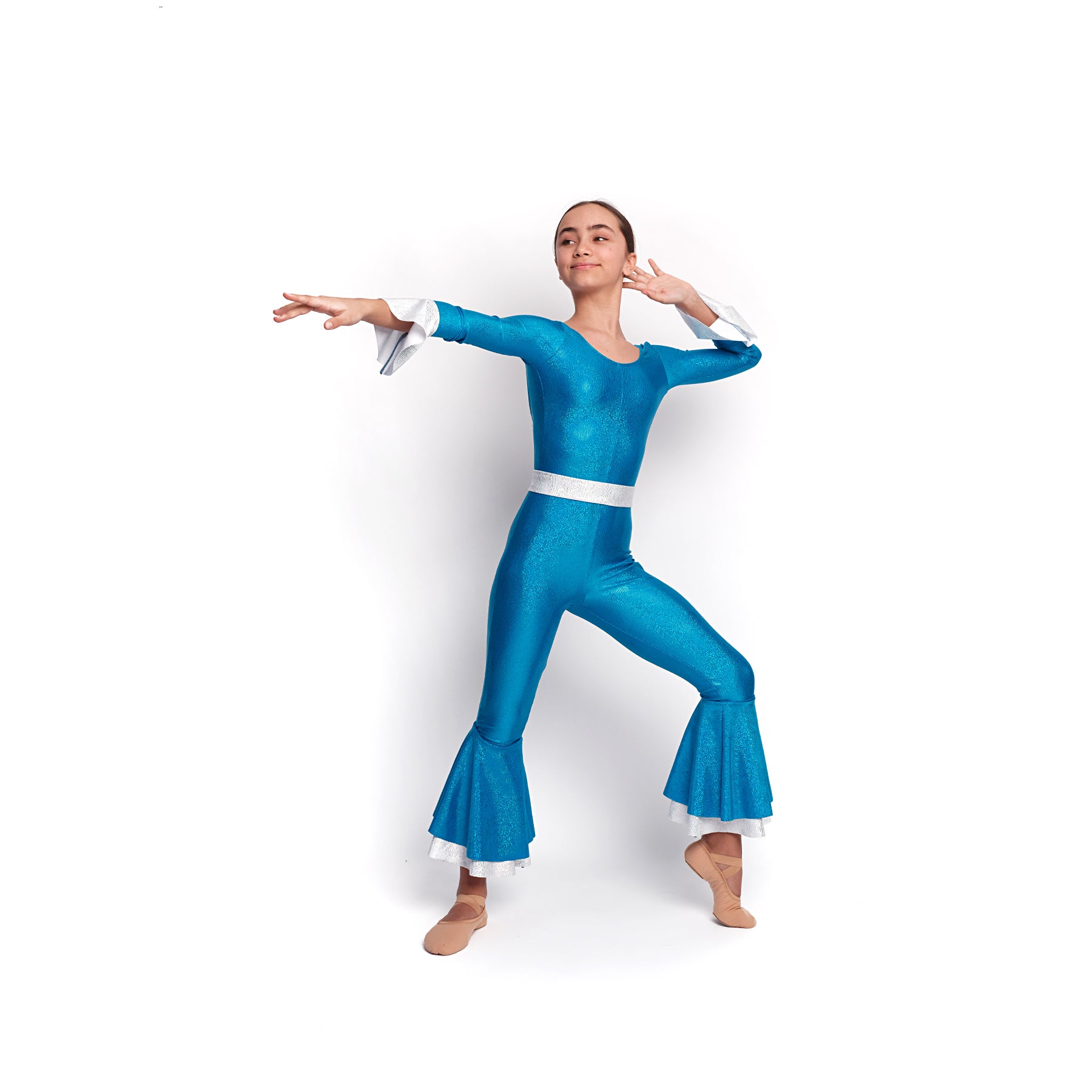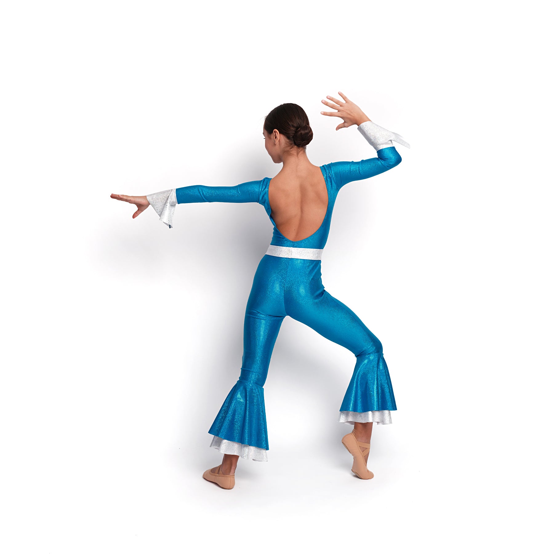 Mono largo con espalda escotada realizado en licra multibrillante. Manga terminada en un volante y dos volantes al final cada una de las piernas. Incluye cinturón