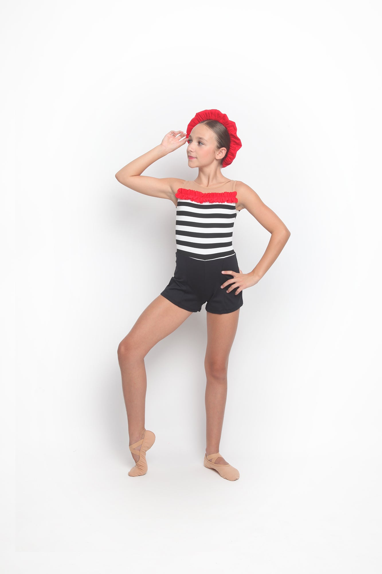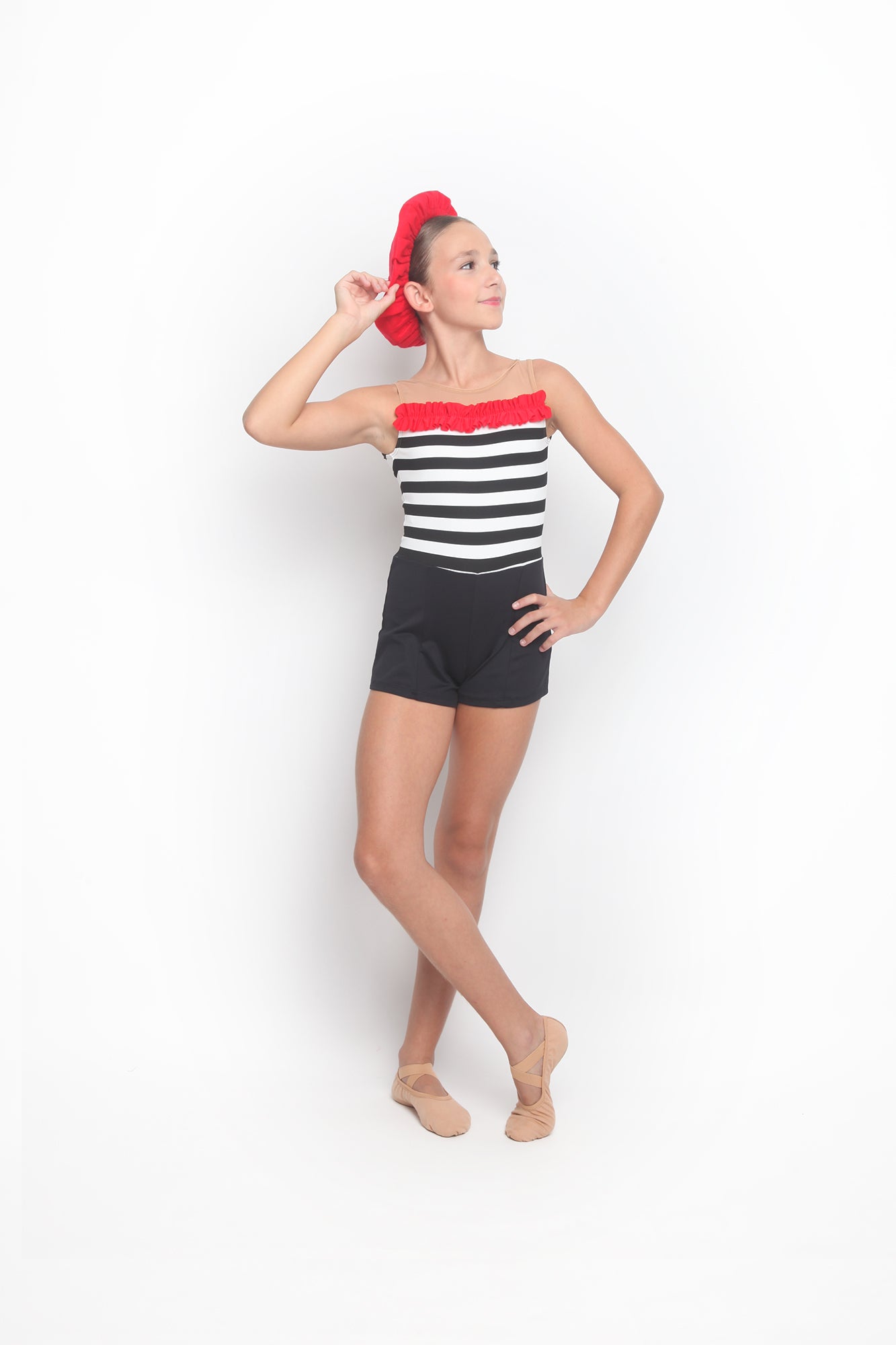 Vestuario de danza jazz confeccionado en lycra con forro delantero. Presenta un diseño de tirantes finos con cuerpo a rayas, volantes decorativos y short integrado. Ideal para coreografías llenas de energía y carácter escénico.