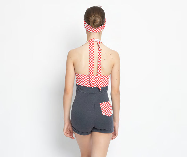 Mono corto en tejido denim elástico combinado con licra a cuadros. Espalda escotada y ajuste al cuello con lazada. Incluye turbante.
