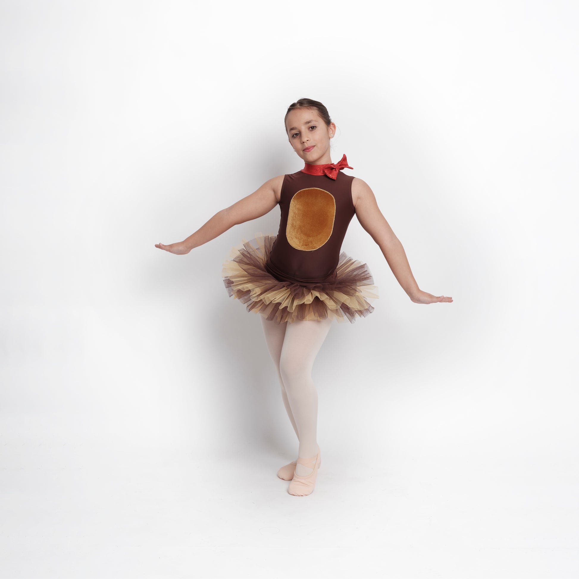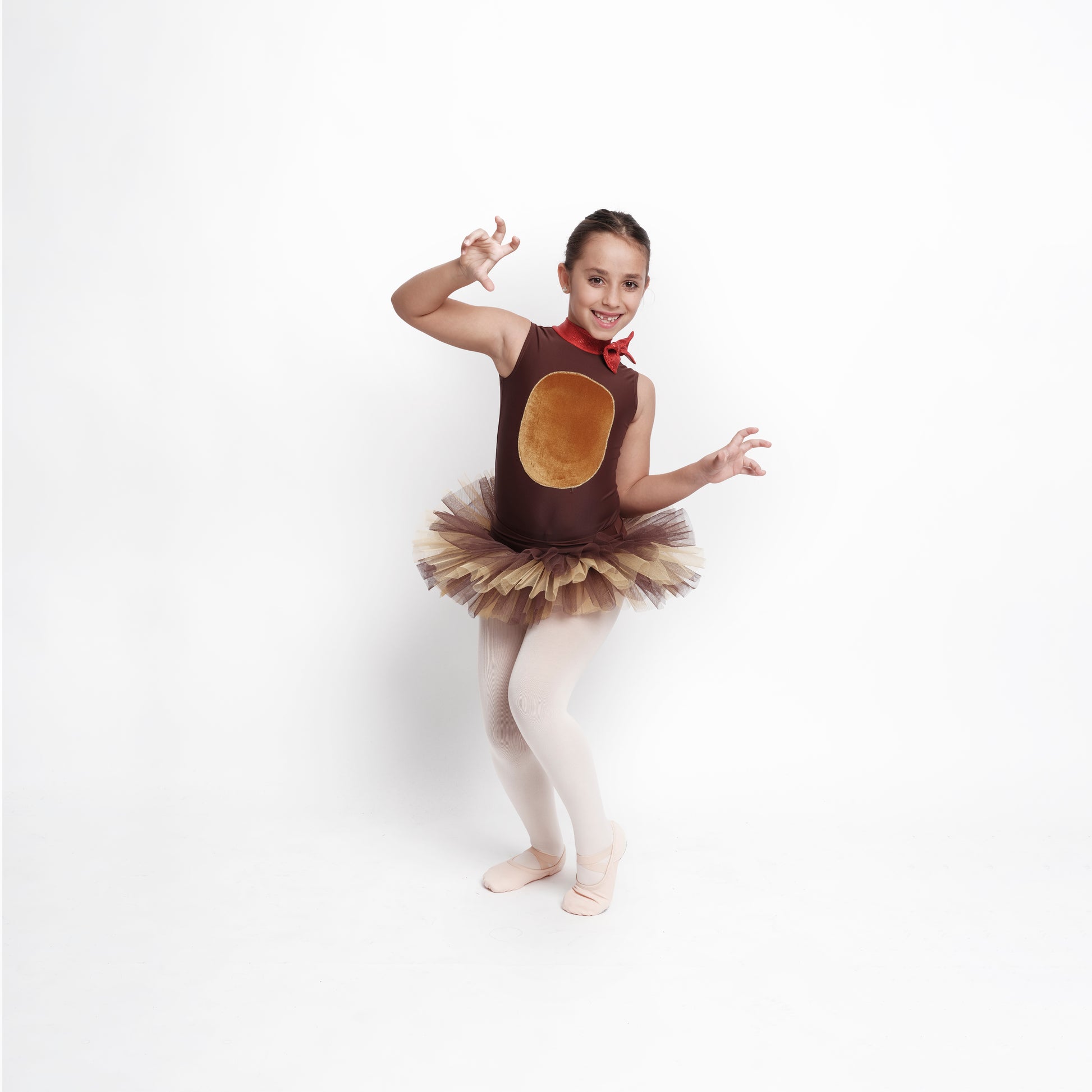 Infantil con cuerpo de licra marrón con detalle en terciopelo color ocre. Lazo rojo al cuello y falda de tres capas en marrón y ocre. Pompón a modo de colita en la parte posterior.