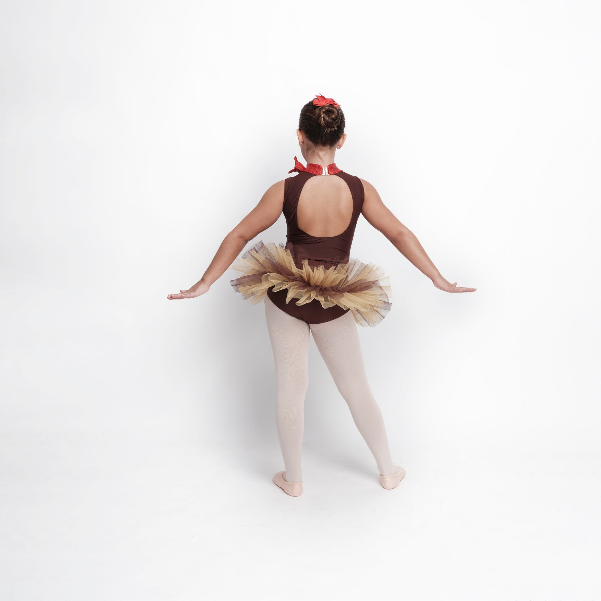 Infantil con cuerpo de licra marrón con detalle en terciopelo color ocre. Lazo rojo al cuello y falda de tres capas en marrón...