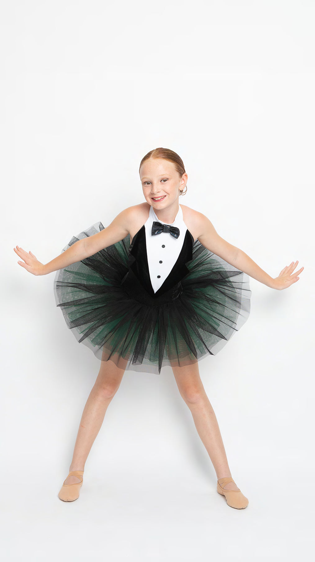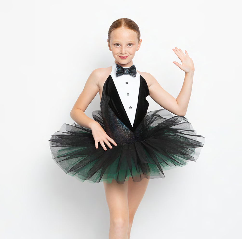 Tutú con maillot en forma de pico, pajarita y botones decorativos. Seis capas de tul.