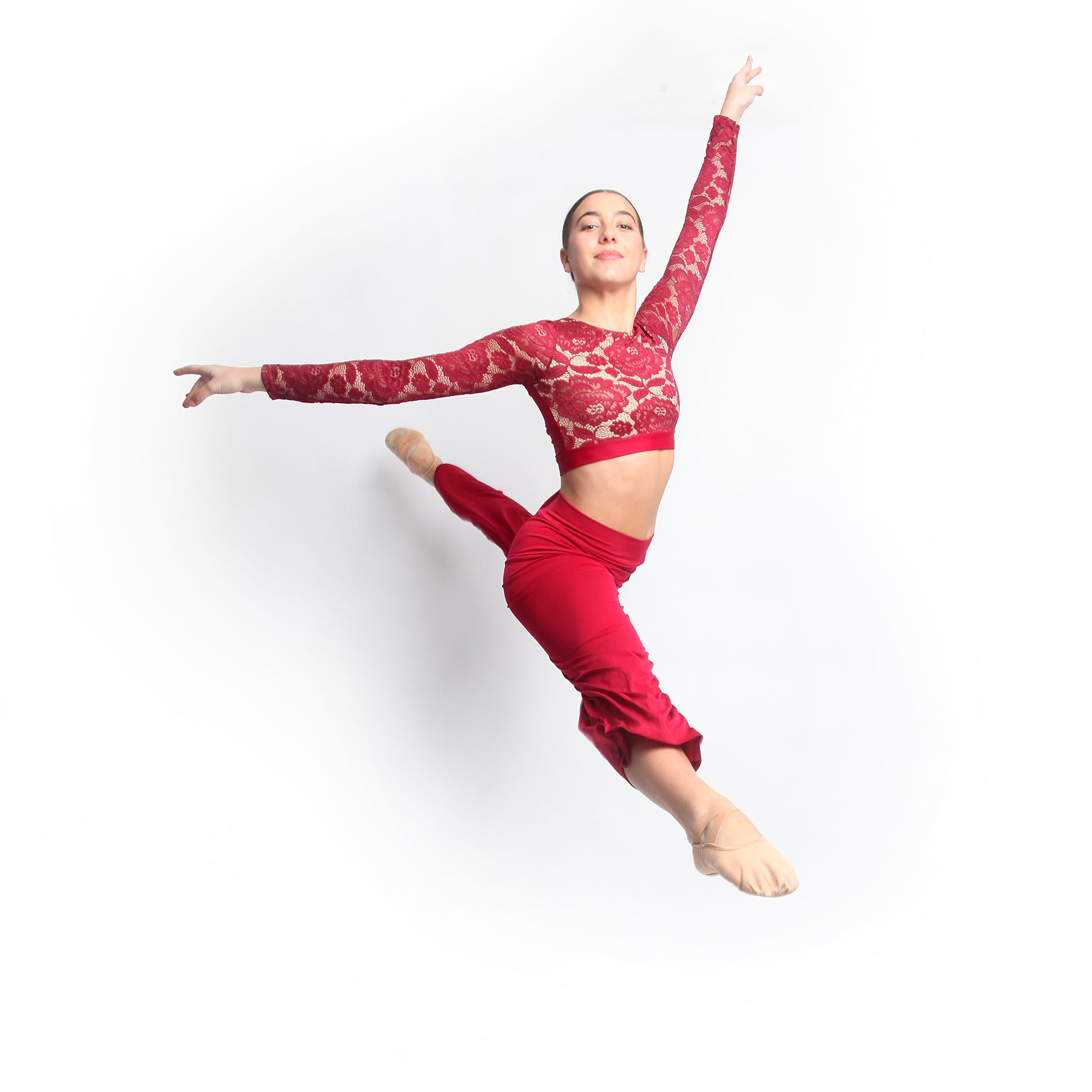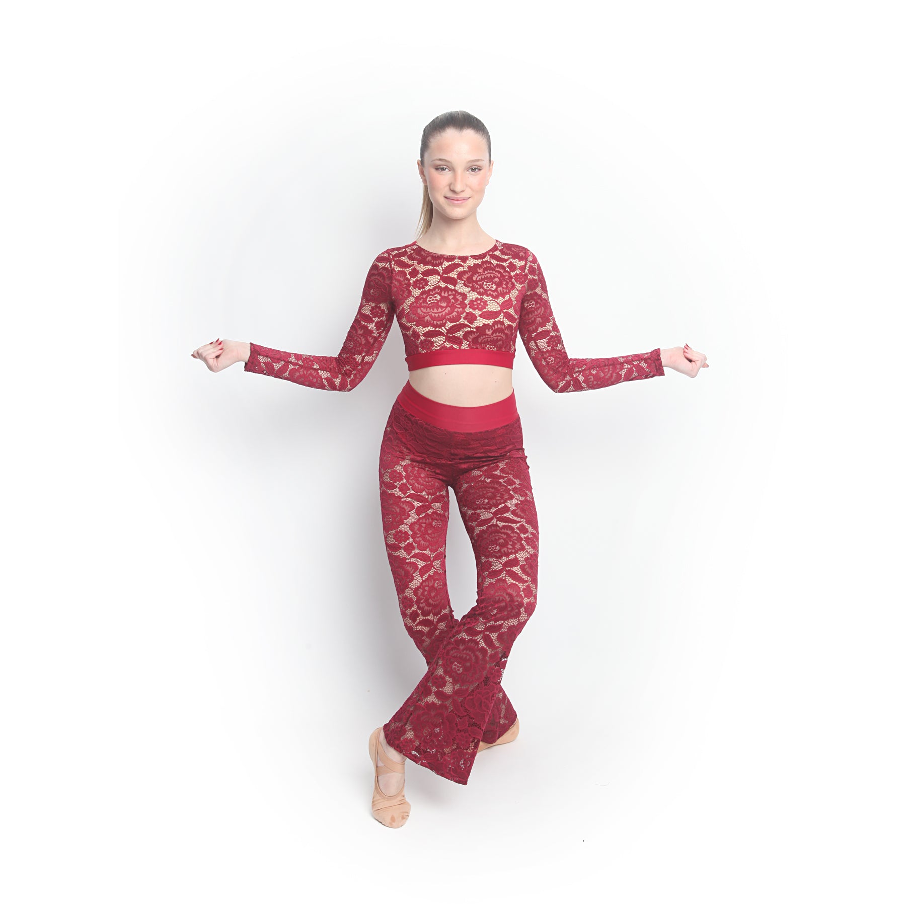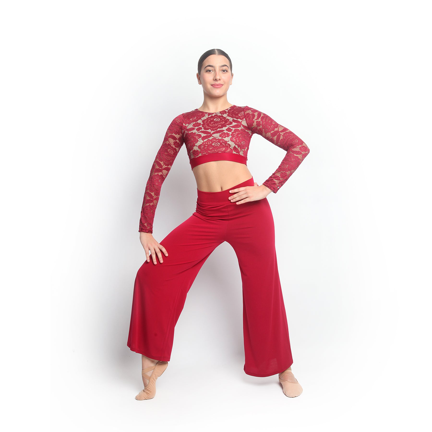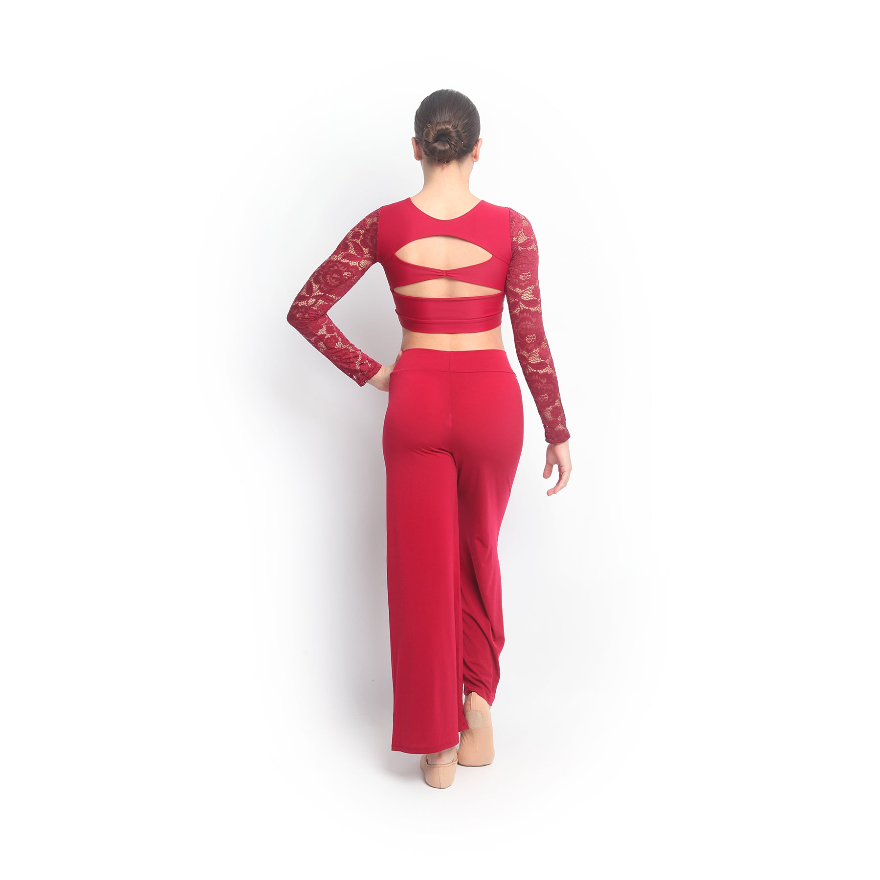 Top de danza contemporánea en blonda, forrado de lycra, con mangas largas y espalda escotada con aberturas que aportan un diseño moderno y estilizado. Ajustado al cuerpo, permite libertad de movimiento y elegancia en escena.