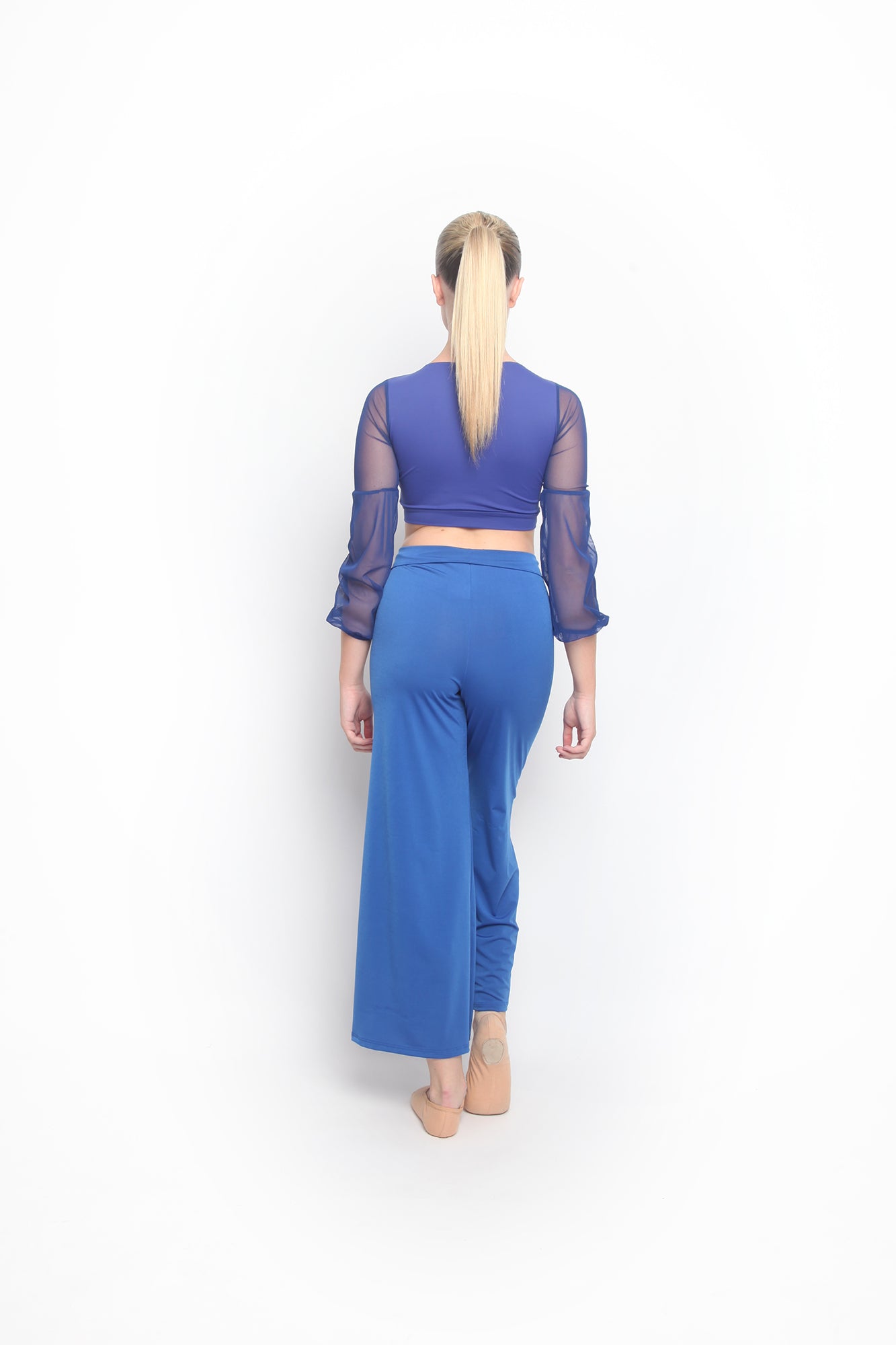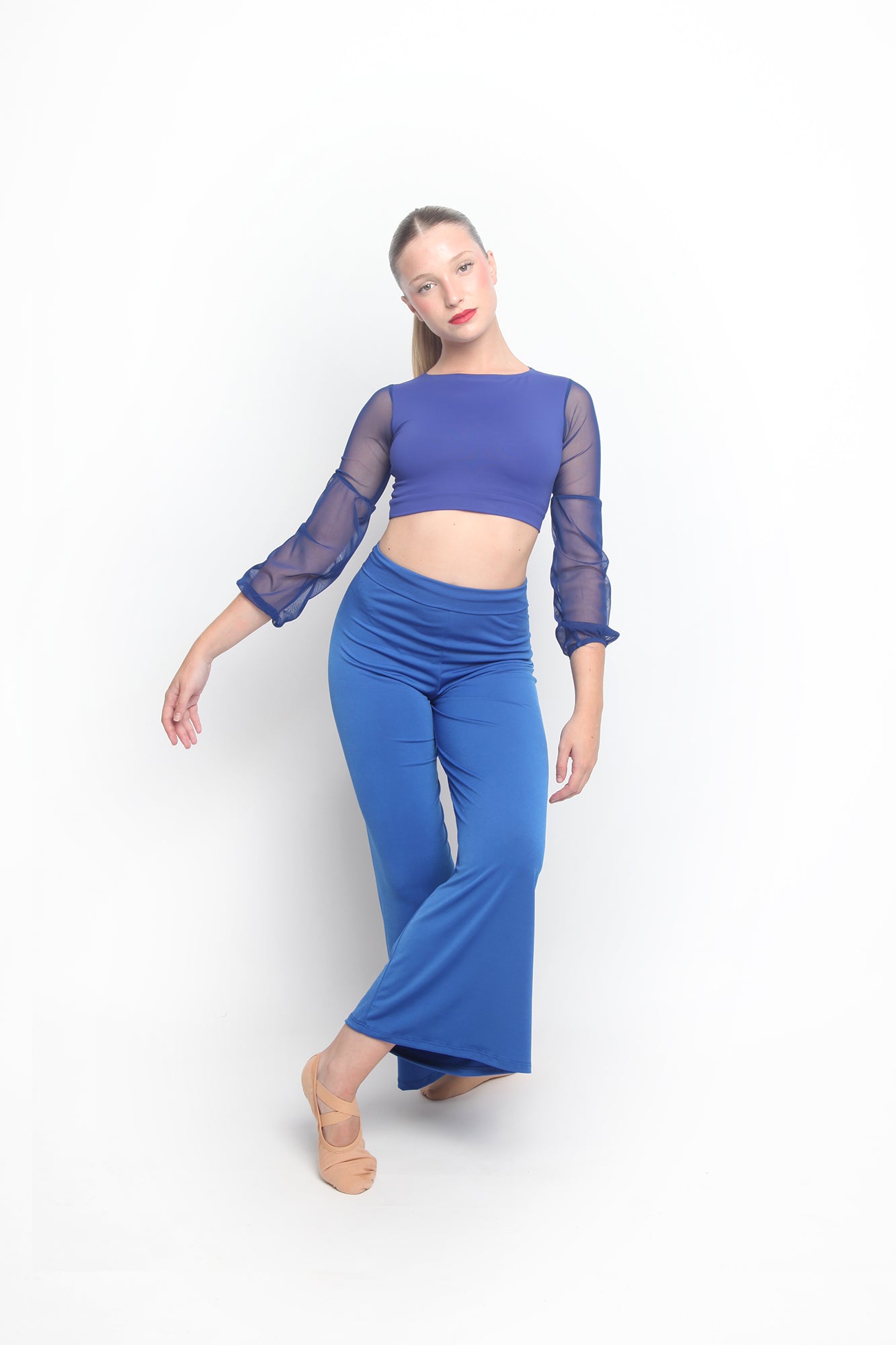 Top confeccionado en licra, con delantero forrado , lo que aporta mejor soporte. Mangas largas con transparencias, que se vuelven abullonadas a partir de medio brazo, aportando un efecto elegante
