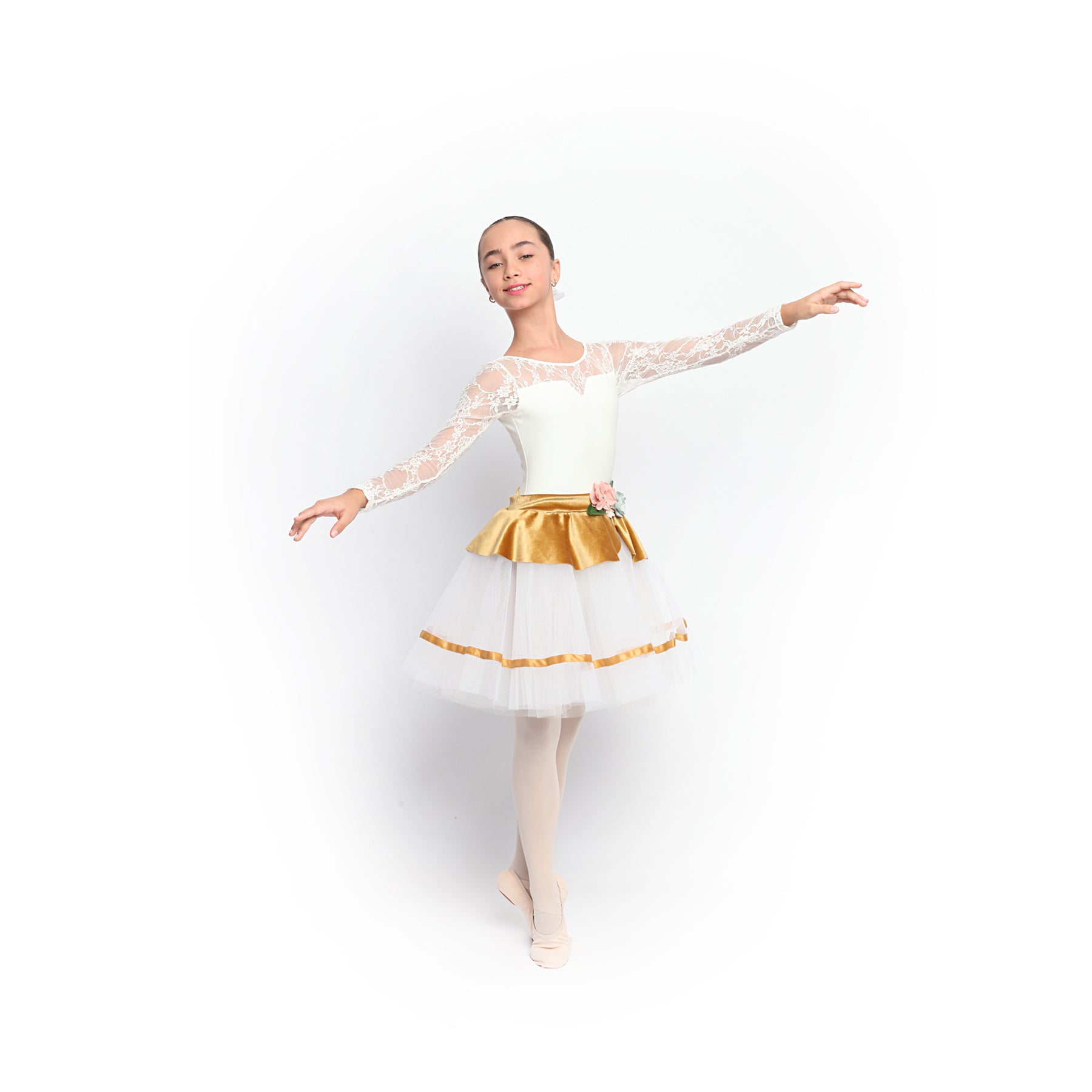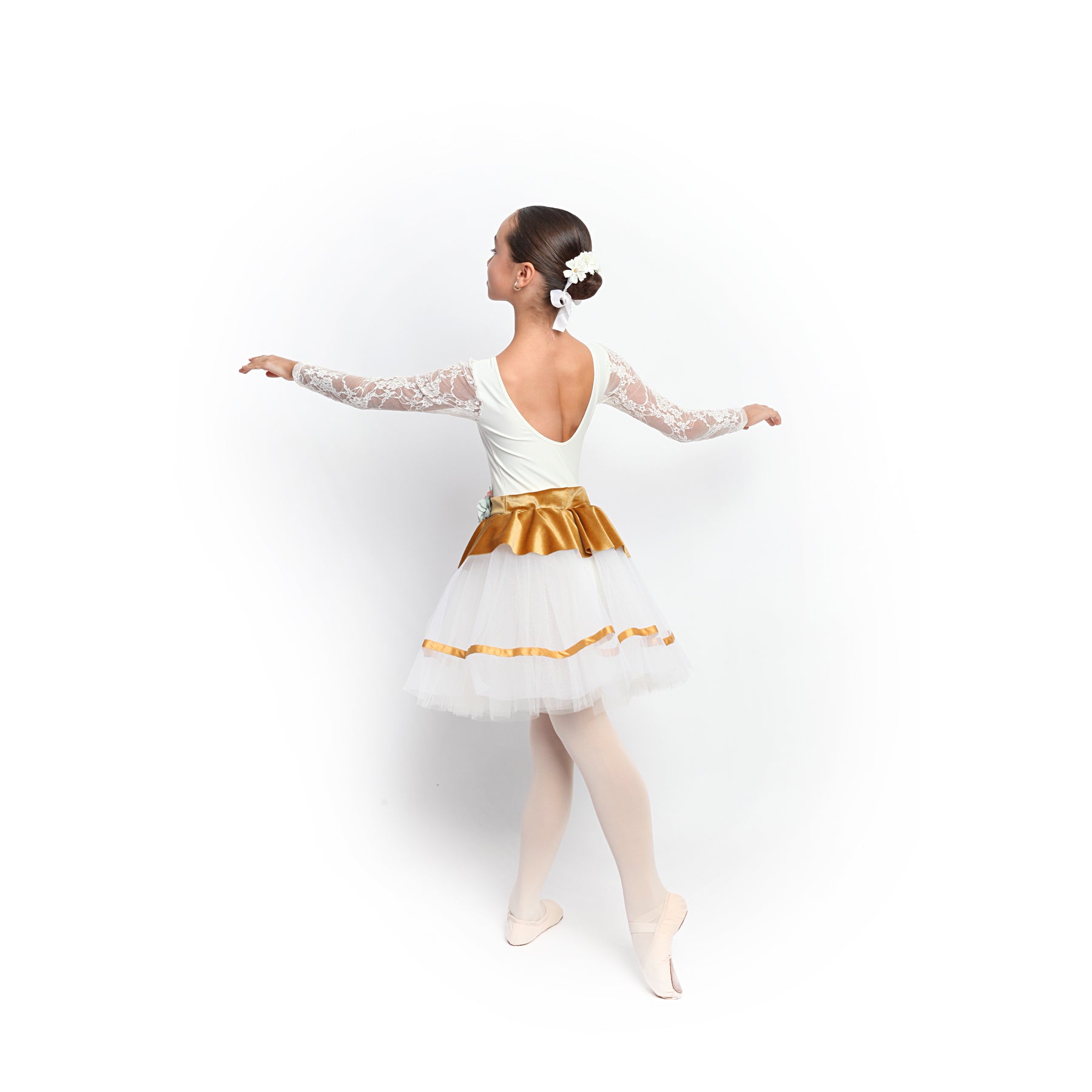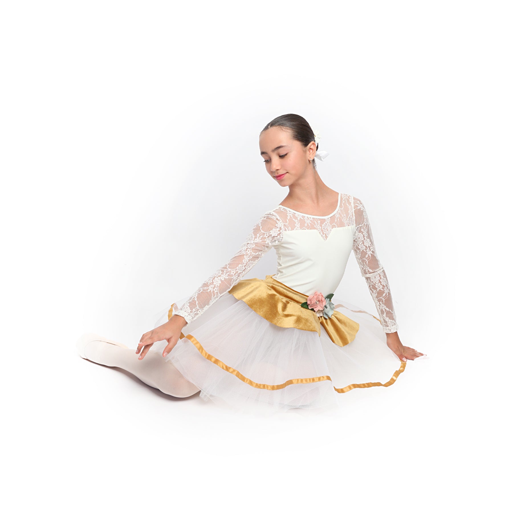 Tutu con cuerpo manga tres cuartos en blonda y licra crudo. Falda de tul crudo y sobrefalda realizada en terciopelo con decoración floral en la cintura.