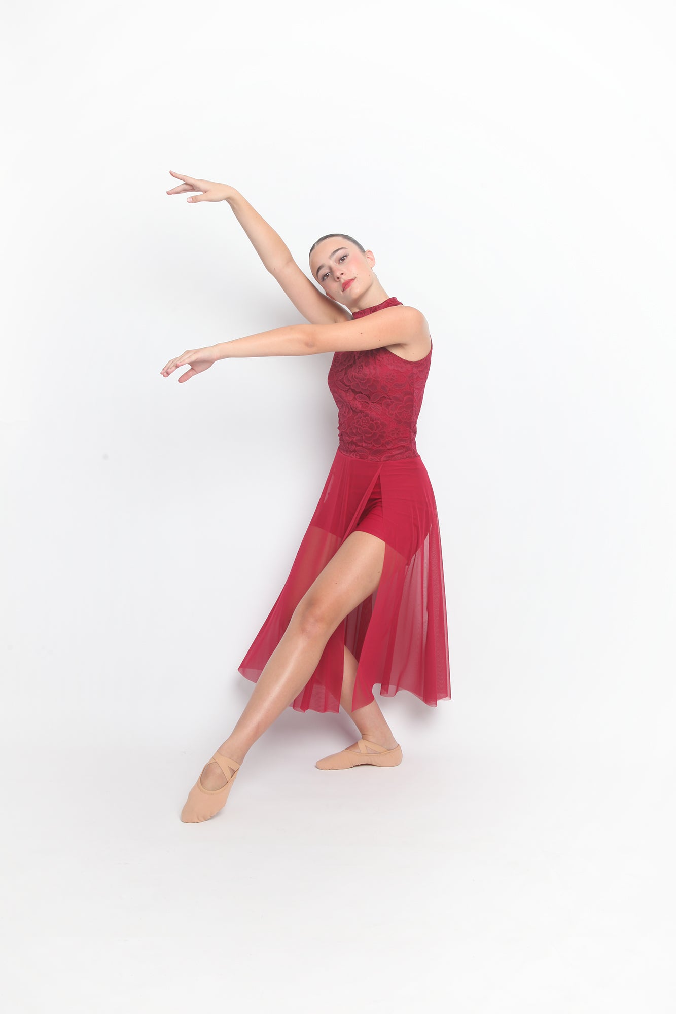 Vestido Lírico Maillot y pantalón confeccionados en licra para un ajuste cómodo y flexible. Falda de tul elástico con abertura lateral, diseñada para aportar mayor movimiento desde la cadera. Cuerpo en blonda, que añade un toque elegante y delicado. Ideal para presentaciones líricas, danza contemporánea o espectáculos que requieran fluidez y expresión corporal.