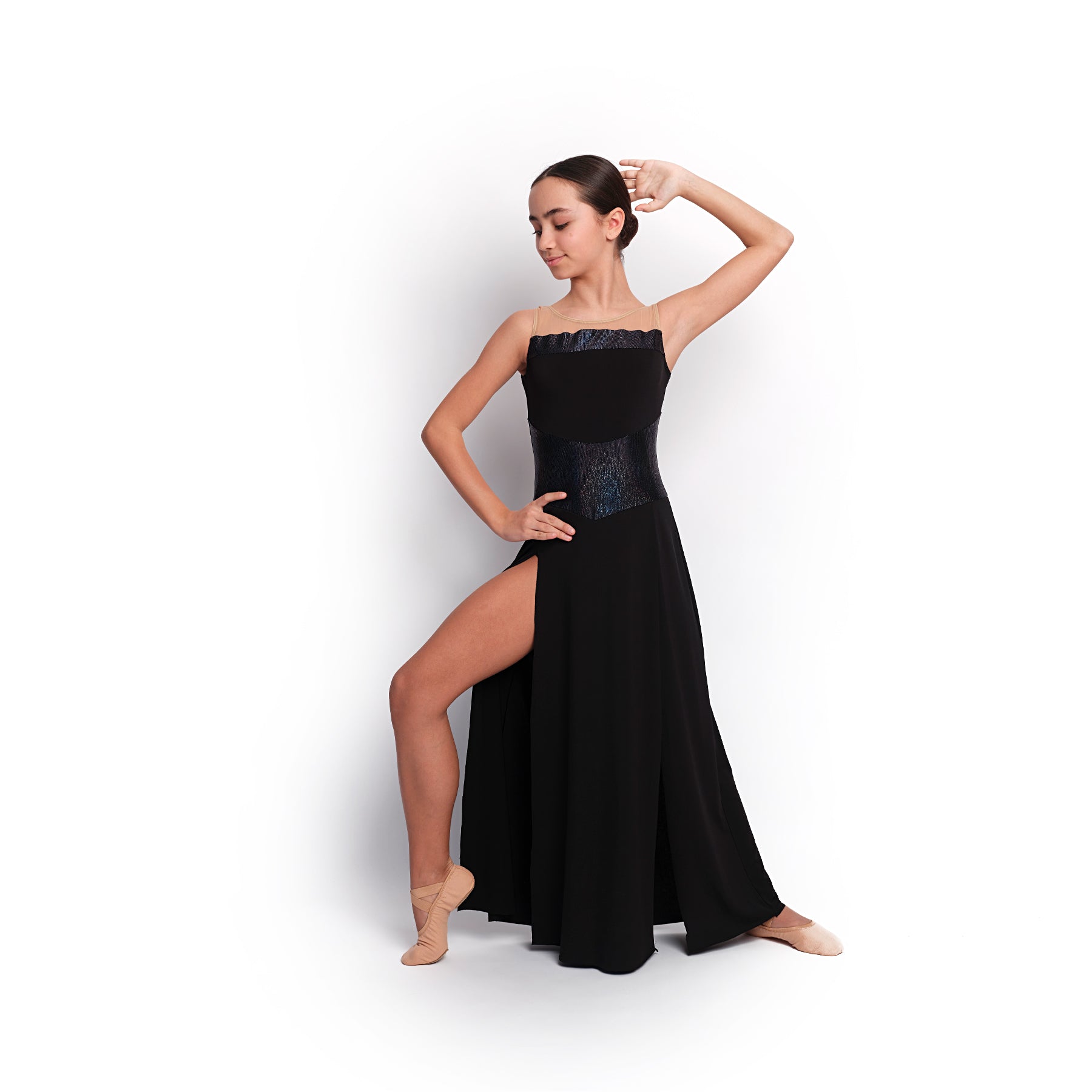 Vestido largo con maillot incorporado realizado en terciopelo y licra multibrillante. Escote en tul red color nude para mayor sujeción. Falda en punto con aberturas laterales.